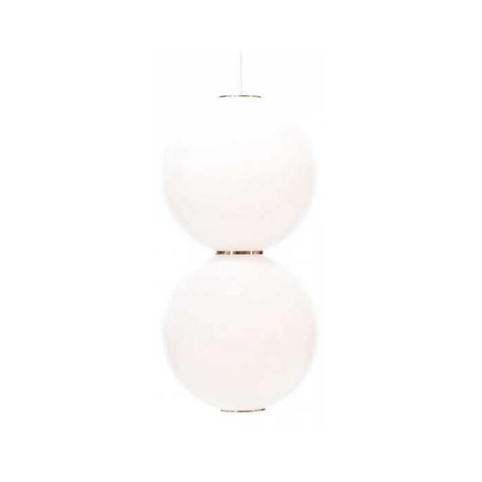 Elle est composée d'une rosace de plafond métallique et d'un cordon d'alimentation gainé de textile blanc supportant un diffuseur constitué de deux sphères superposées en verre opalin (diamètre de 18 centimètres) habillées de détails de différents coloris au choix.