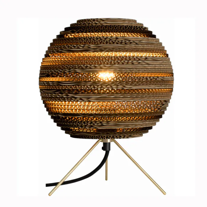 La lampe à poser Moon, en forme de globe, est une conception de la marque Graypants, qui crée des luminaires et des objets à base de cartons recyclés, fabriqués et assemblés à la main.