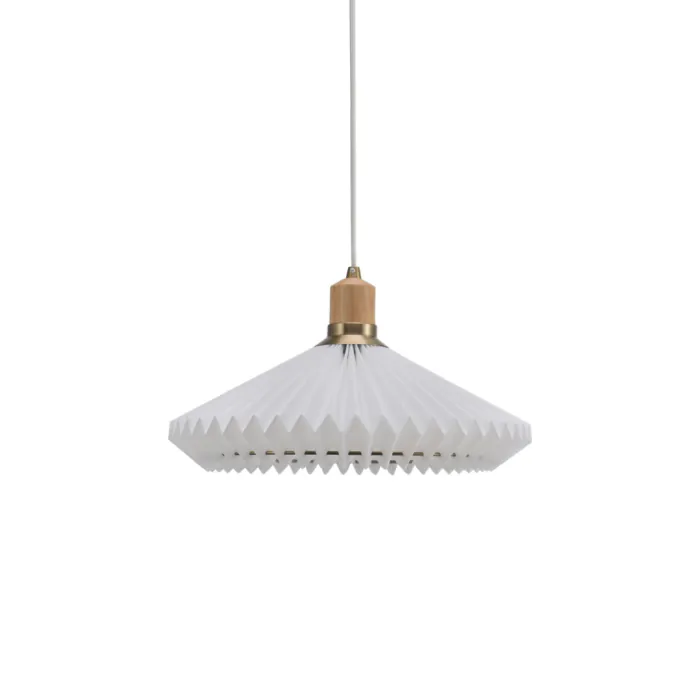 Chaque pièce de cette collection est conçue avec un abat-jour plissé en PVC plissé et des finitions raffinées en chêne et laiton antique, rappelant les nuances subtiles de la Ville Lumière.