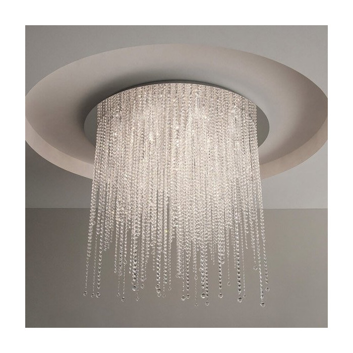 Sublime plafonnier rond Ice Fall composé d'une plaque ronde en métal chromé et agrémenté d'une pluie de pampilles en cristal de différentes hauteurs (max110cm).