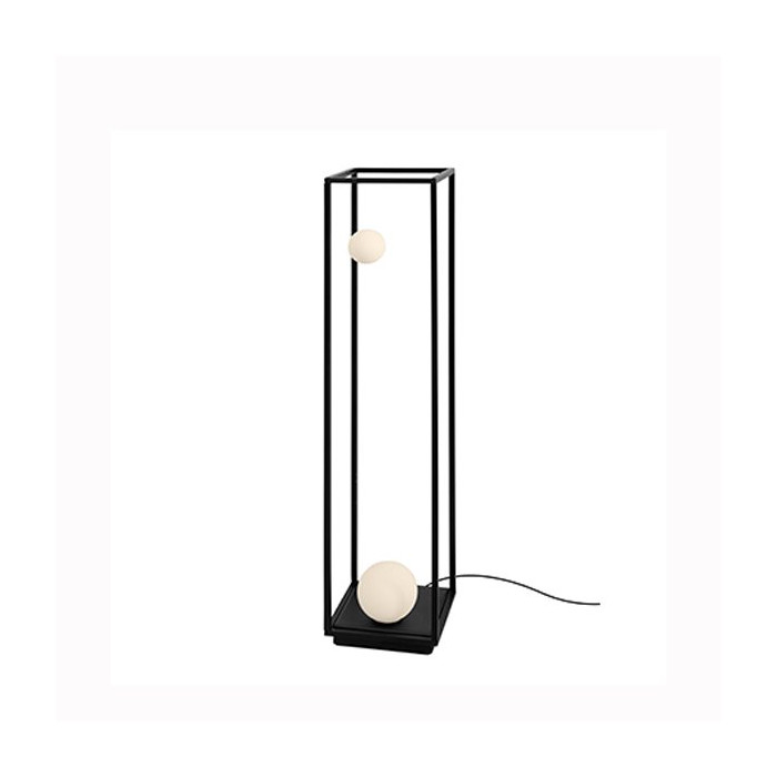 Les sphères en verre soufflé fixées à la structure sont finies avec un effet givré et semblent suspendues dans le cadre métallique.