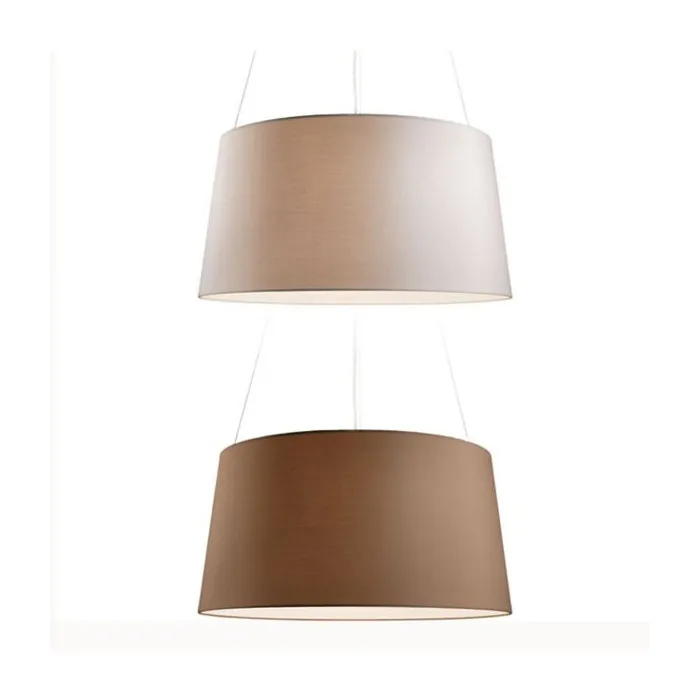 Le diffuseur en tissu ignifugé, fermé par un disque en aluminium micropercé anodisé, existe en trois coloris : blanc, écru et moka.