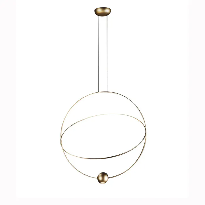 Inspirée du mouvement astral, la lampe se caractérise par deux anneaux métalliques, dont l'un peut être réglé à différents angles pour produire fluidité et mouvement, ainsi qu'une petite sphère au bas de la lampe qui contient la source lumineuse.