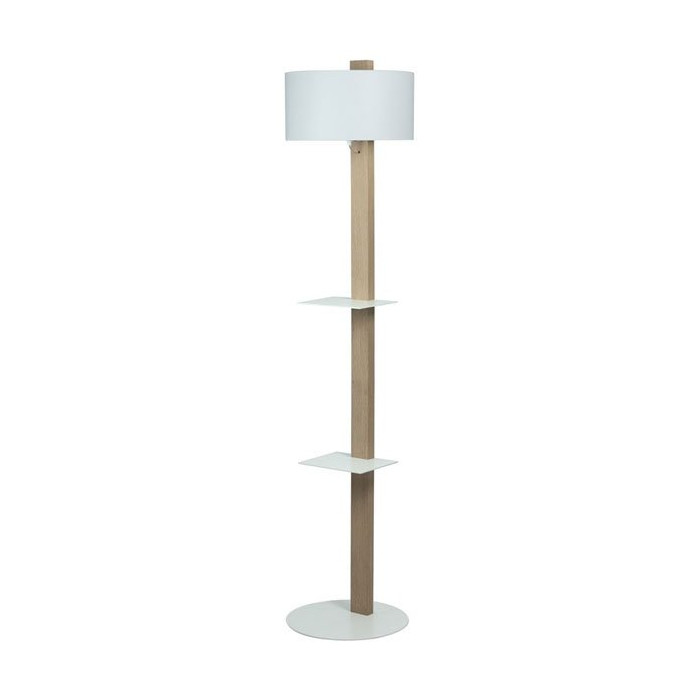 Ce luminaire, à l'esprit scandinave et contemporain, possède un pied en hêtre naturel, un abat-jour cylindique en tissu et deux tablettes en métal amovibles.
