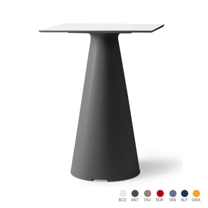 Une ligne simple qui se décline en table haute ou table lounge avec au choix sept différents coloris pour le pied, un plateau carré ou rond de plusieurs dimensions de coloris blanc ou anthracite.