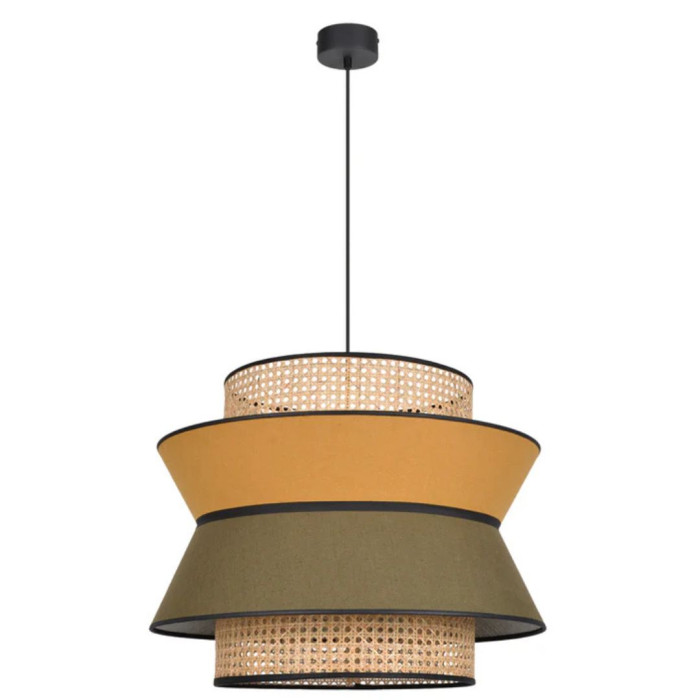 Elle est fabriquée avec un assemblage de trois abat-jours en lin et cannage, méthode ancienne de tissage, qui laisse passer une jolie lumière.