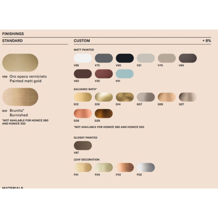 Elle est composée d'une structure en métal couleur or mat et de plaques irrégulières d'onyx naturel disposées asymétriquement, faisant office de diffuseurs avec un système LED intégré.