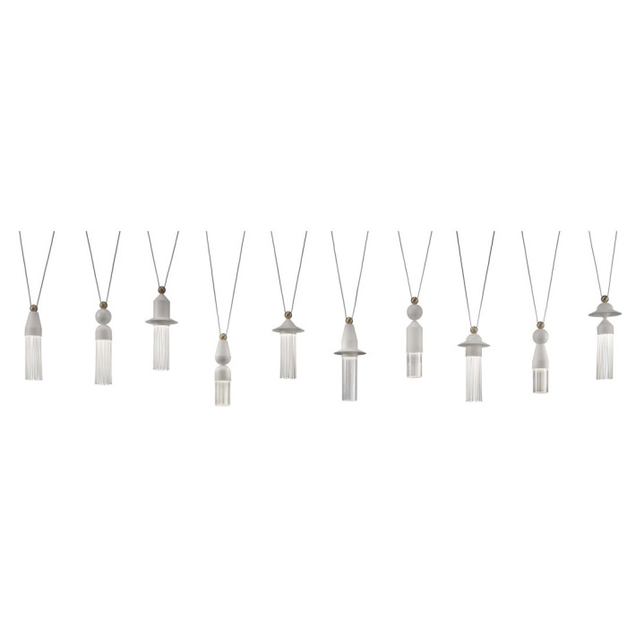 Cette collection se décline en neuf différentes pièces individuelles (dôtées d'un câble de suspension), deux appliques, deux suspensions individuelles format XL (dôtées d'un câble de suspension) et trois compositions (dôtées de deux câbles de suspension).