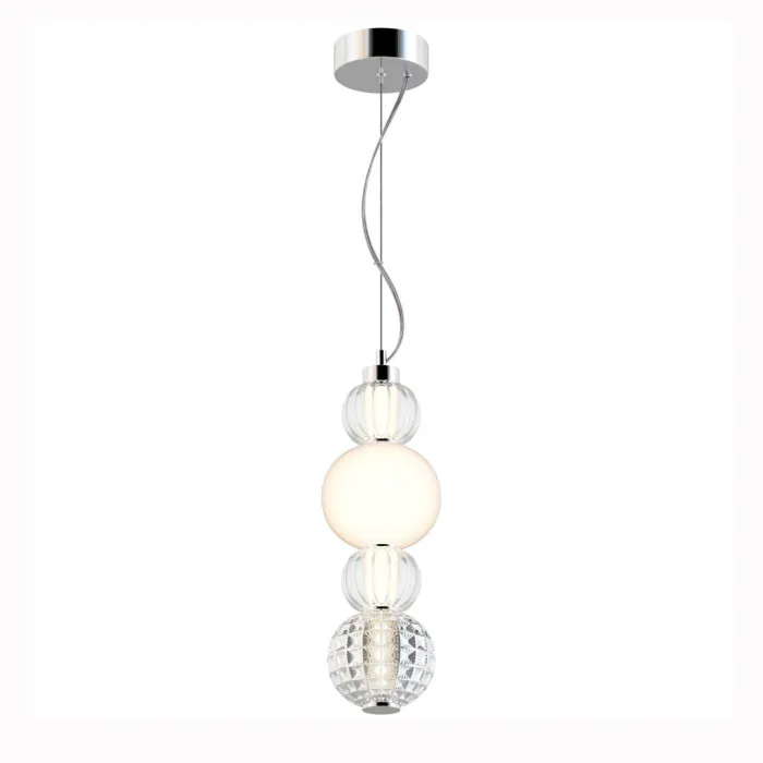 Elle se compose de 4 diffuseurs ronds en verre soufflé de différentes finitions, attachés à un câble et une patère en chrome.