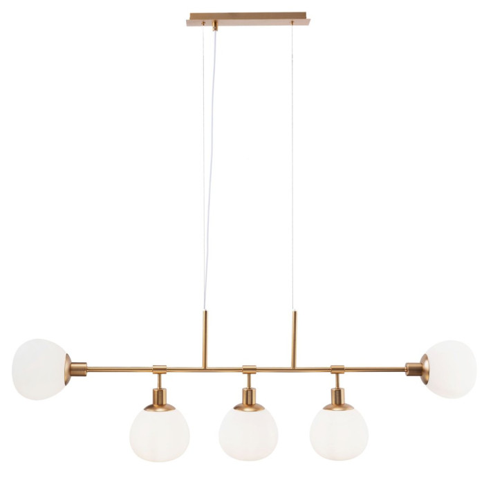 Elle se compose d'une structure métallique de coloris chrome ou laiton au choix et de cinq globes en verre dépoli.