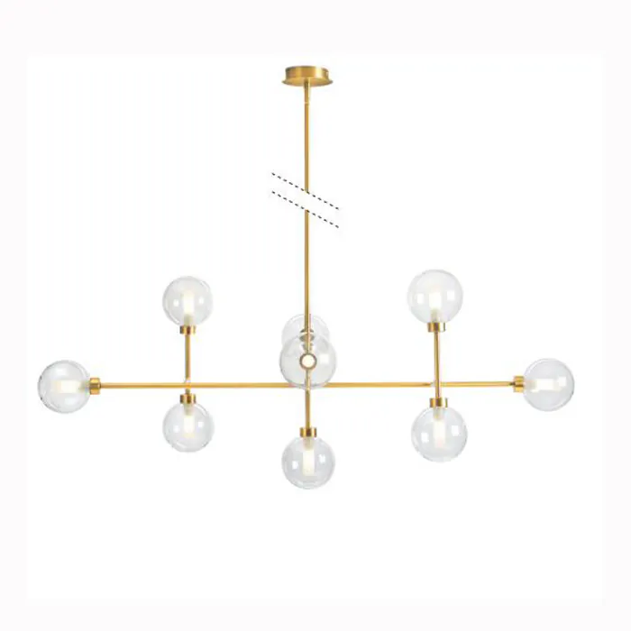 Graphique et minimaliste, il est fabriqué avec une structure en laiton satiné sur laquelle sont fixés neuf diffuseurs en verre borosilicate transparent.