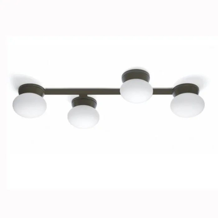 Il est composé de quatre diffuseurs en verre soufflé blanc laiteux dont le cadre est en métal peint en gris tourterelle.