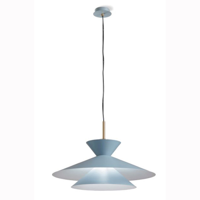 Elle est composée de trois diffuseurs superposés en métal peint bleu ciel, d'un support en laiton brossé et d'une rosace en métal bleu ciel.