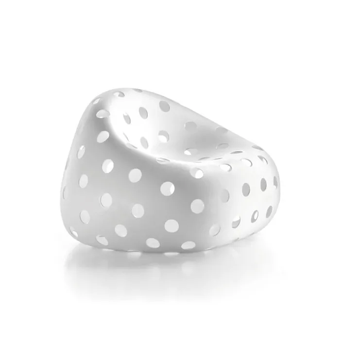 Superbe fauteuil Airball créé par Alberto Brogliato qui, grâce à des ouvertures sur la surface du siège opaque, crée des effets de lumières uniques et personnalisées, avec sa source lumineuse placée à l'intérieur.
